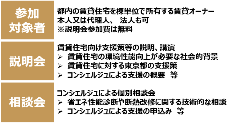 東京都は、賃貸住宅の省エネ性能診断や断熱改修を促進するため、都内の賃貸住宅を棟単位で所有する賃貸オーナーの皆様を対象に、賃貸住宅を取り巻く社会環境の変化、国や東京都の制度の内容、改修のメリット等の説明や、賃貸オーナーの皆様の不安や疑問を解消するためのセミナーを開催します。