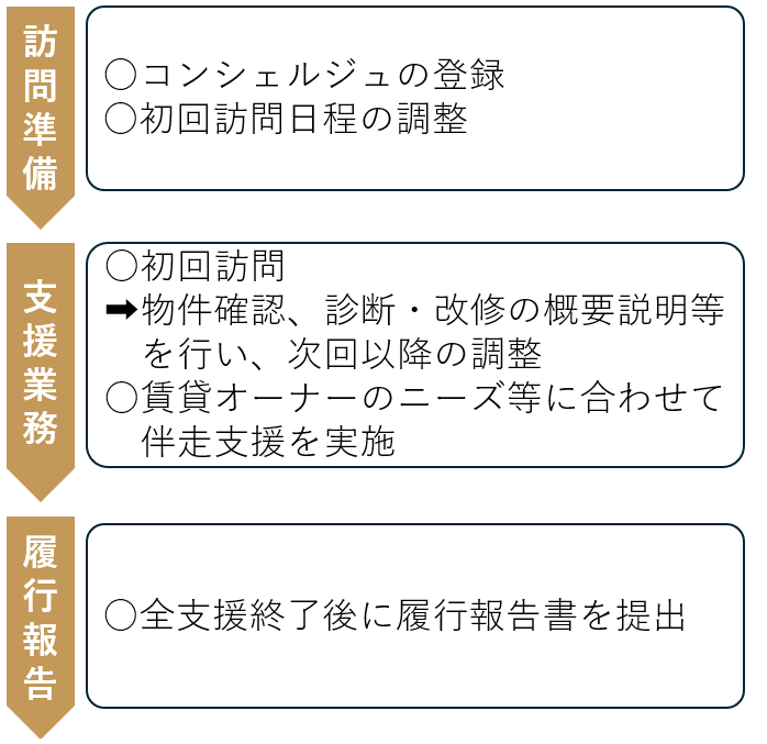コンシェルジュ事業者は、賃貸オーナーから支援を申し込まれた賃貸物件を訪問し、物件を確認したうえで、省エネ性能診断の前後及び断熱改修の前後等で必要な説明や支援を行います。